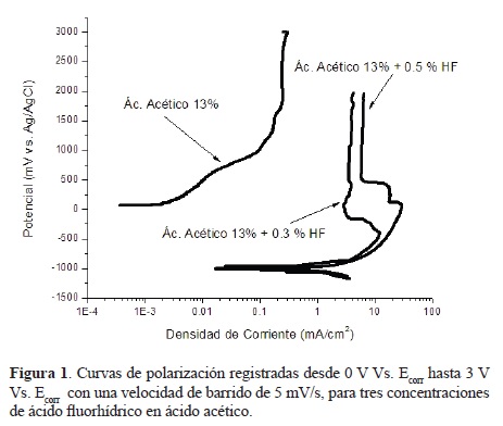 La figura 1 muestra la comparación de las curvas de polarización correspondientes a la primera fase de la investigación, en la cual se investigó el efecto sobre la superficie del titanio, de la adición de ácido fluorhídrico en distintas concentraciones a las soluciones de ácido acético, para así determinar un rango de concentraciones de ión fluoruro adecuado para llevar a cabo las anodizaciones. De acuerdo a la literatura previa se ensayaron dos concentraciones de ácido fluorhídrico: 0.3 wt% y 0.5 wt% adicionadas a una solución de ácido acético glacial en proporción (7:1) (una parte de ácido acético glacial por 7 partes de solución de HF a 0.3 ó 0.5 wt%). La concentración de una solución que sólo contiene ácido acético para la misma proporción en volúmen corresponde a una concentración de aproximadamente 13 wt% de CH3COOH, por lo tanto se utilizó una solución acuosa de ácido acético con esta concentración, carente de ácido fluorhídrico, para efectos de comparación. Como se observa en la figura, las densidades de corriente (I) aumentan con el incremento en la concentración de HF, analizando la pendiente de Tafel anódica en las tres curvas se puede advertir la misma tendencia para la densidad de corriente de corrosión (Icorr), pasando de 3.5x10-3 mA/cm2 para la solución de ácido acético al 13 wt% (sin HF) a 4 mA/cm2 para la solución de ácido acético con 0.3 wt% HF y finalmente a 7 mA/cm2 para la solución de ácido acético con 0.5 wt% HF. Las densidades de corriente (I) a lo largo del barrido aumentan en una década aprox. al pasar de la solución en ausencia de HF a la de 0.3 wt% HF, y en aproximadamente 1.5 décadas al pasar de la solución sin HF a la de 0.5 wt% HF. También se observó un desplazamiento del potencial de corrosión (Ecorr) hacia valores más negativos conforme aumenta la concentración de ácido fluorhídrico, exhibiendo un Ecorr de +80.8 mV vs. Ag/AgCl en la solución de ácido acético en ausencia de HF, un Ecorr de -981.5 mV vs. Ag/AgCl en la solución con 0.3 wt% HF y de -1035.4 mV vs. Ag/AgCl en la solución que contiene 0.5 %wt HF. La curva en ausencia de HF tiene un comportamiento muy particular, que se manifiesta por una zona activa seguida de una corriente límite (I) constante, con magnitud aproximada de 0.25 mA/cm2. Por su parte, las curvas correspondientes a las soluciones con 0.3 wt% HF y 0.5 wt% HF mostraron también un comportamiento característico, muy similar entre ellas, pero claramente distinto del de la solución carente de HF. Ambas presentan al inicio una región activa, posteriormente una zona pasiva, en la cual la densidad de corriente medida (I) disminuye hasta un valor fijo, en el caso de la solución de ácido acético con 0.3 wt% HF, de 11 mA/ cm2 se reduce a 3 mA/cm2, mientras que en la solución de ácido acético con 0.5 wt% HF disminuye de 28 mA/cm2 a aproximadamente 6 mA/cm2. En esta transición de un estado activo a uno pasivo pueden observarse, para este sistema en particular, una especie de "escalones" característicos en los cuales la densidad de corriente tiene pequeñas etapas de corriente constante y otras etapas de decrementos. Este fenómeno, el cual a nuestro conocimiento no ha sido reportado en la literatura, podría deberse a un proceso particular de disociación del ácido acético (el cual formaría complejos iónicos en solución o eventualmente precipitados sobre el titanio) que influenciaría directamente el comportamiento de la corriente catódica del contralectrodo e indirectamente el de la corriente anódica. Esto habría de corroborarse por el análisis de las especies presentes en la solución, lo cual está fuera del propósito de la presente investigación. Al final de las curvas se mantiene un valor fijo para la densidad de corriente, con magnitudes grandes en comparación con la corriente límite alcanzada en ausencia de HF, de 4.1 mA/cm2 y 6.4 mA/cm2 para 0.3 wt% HF y 0.5 wt% HF respectivamente. En el caso de la solución conteniendo 0.3 wt% HF, se observa un fenómeno muy particular el cual no se presenta a las otras concentraciones ensayadas, al menos no en el intervalo de potencial al cual se polarizaron las muestras. Dicho fenómeno sucede una vez alcanzado el estado de pasividad (tras la transición activo-pasivo escalonada ya descrita) a una corriente aproximada de 3 mA/cm2 y consiste en una re-activación, manifestada por un pequeño y segundo incremento de corriente, a un potencial aproximado de +230 mV vs. Ag/AgCl, para rápidamente volver a disminuir, aunque en menor medida, finalmente estabilizándose en un valor aproximado de 4.1 mA/cm2. Este súbito pico o "saliente" en la curva anódica ha sido atribuido en la literatura a la iniciación de un proceso equilibrado de formación-disolución de óxido, i.e., la iniciación propiamente dicha del crecimiento auto-organizado de nanoporos [18]. Este pico no se observa en la solución de acético con 0.5 wt% HF, al menos no de manera evidente, lo cual indicaría que la formación de poros auto-organizados a esta última concentración es más difícil de lograr.