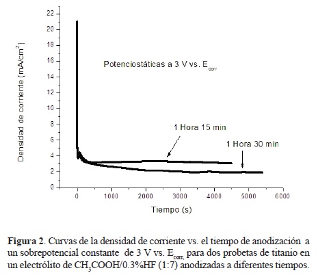 La segunda fase de la investigación corresponde a las anodizaciones potenciostáticas, i.e., la aplicación de un sobrepotencial constante de 1 V vs. Ecorr ó 3 V vs. Ecorr, al cual se llegó de manera gradual por medio de un barrido de potencial rápido (rampa de potencial o curva de polarización rápida) de 500 mV/s (después de haber realizado u omitido el pulido y la prueba galvanostática) en el electrólito de HF+ CH3COOH. A pesar de haber determinado que la concentración de CH3COOH + 0.3 wt% HF (1 :7) era más adecuada que la de CH3COOH + 0.5 wt% HF (1 :7), se decidió también experimentar con ésta última. La figura 2 muestra la comparación de dos curvas de la densidad de corriente registrada contra el tiempo de anodización (I Vs. t), durante el proceso de anodización (prueba potenciostática) de dos probetas de titanio en un electrólito de CH3COOH/0.3%HF (1:7) a 3 V vs. Ecorr. La prueba potenciostática duró 1 hora con 15 minutos para la primera probeta y 1 hora con 30 minutos para la segunda de ellas.