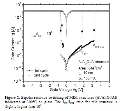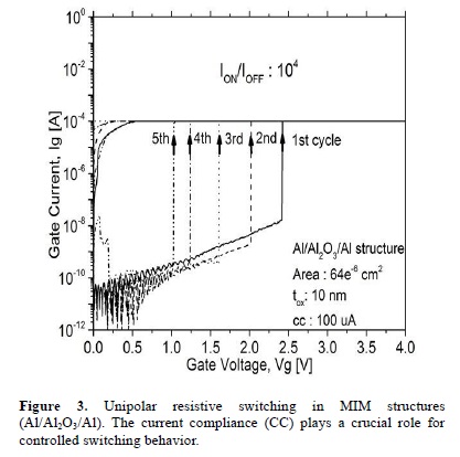 Is important to emphasize that reliable RRAM memory device must ensure endurance cycles beyond two orders in magnitude. Our devices with Al/Al2O3/Al structure (figures 2 and 3) have a conductivity window (ION/IOFF) greater than 104 in magnitude for both modes of operation. This broader relationship between the OFF state (HRS) and ON state (LRS) is very important because it increases the reliability to maintain the stored logic states within this memory device for a long time.