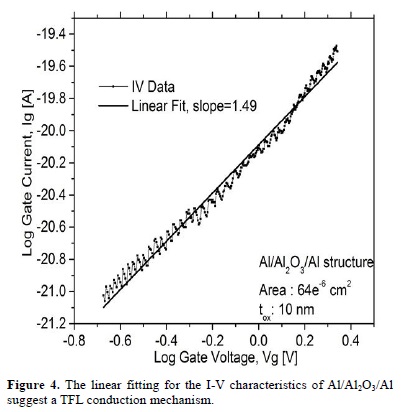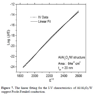 A linear fitting of the I-V curve for the Al/Al2O3/W structure (Al2O3= 20 nm, before breakdown) is shown in Figure 7. Here the dominant conduction mechanism is Poole-Frenkel. In a similar way to the Al/Al2O3/Al structure, traps inside the oxide have a major role in the transport of carriers. After filling-up these traps, they would allow generation of additional conductive filaments.