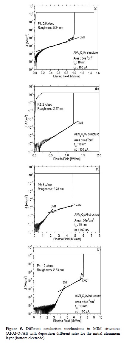 As surely inferred, the Metal/Al2O3 interface is also of great importance for proper electronic conduction of carriers. Figure 5 shows different conduction processes for similar MIM structures (Al/Al2O3/Al). Here, the deposition ratio for the last portion of the first aluminum layer (bottom electrode) changed as follows: