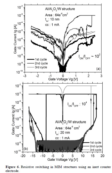 On the other hand, some memory devices consist of an active electrode (AE) which acts as a source of mobile cations and an electrochemically inert counter-electrode (CE, usually Pt or W) where the cations get reduced to build up the metallic filament [2,15,19-20]. The mechanism for memristance effect in this type of memory device is widely accepted as a redox reaction which involves the oxidation of the AE atoms to produce mobile cations that migrate inside the thin oxide film and are reduced at the CE to form a metallic filament inside the thin oxide film (ON state), and finally, the dissolution and/or rupture of this metallic filament (OFF state) [2, 20-22]. Fig. 6 shows the I-V characteristics for the remaining Al/Al2O3/W structures. Al2O3 has thickness of 10nm for Fig. 6(a) and 20 nm for Fig. 6(b).