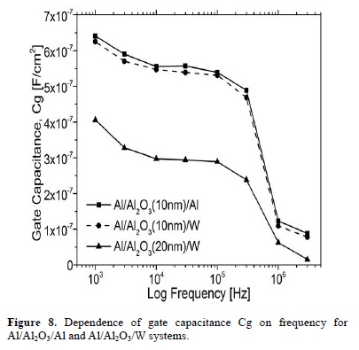 It is important to mention that both devices (Al/Al2O3/Al and Al/Al2O3/W) show that there is no switching between HRS and LRS until both SET and RESET voltages are reached. This ensures that the stored information will not be lost even if parasite voltages (lower that VSET and VRESET) are developed or applied on the integrated circuit. Fig. 8 shows the dependence of gate capacitance density Cg on frequency after C-V measurements at room temperature for MIM structures having 10nm and 20nm in Al2O3 thickness respectively. It is clearly shown that for higher frequencies (up to 3 MHz), lower capacitance density Cg are obtained. Also, the dielectric constant relative to Al2O3 extracted from the C-V curves is εr ~ 7, which suggest that chemical reduction of the Al2O3 to AlxOy when the gate oxide makes physical contact with the top aluminum electrode occurs. The maximum capacitance at each frequency in the full range is different between one structure and another, as expected. The former is due to the difference in thickness of the aluminum oxide (Cg higher for Al2O3=10nm). This difference in thickness also influences the behavior of the capacitance Cg at low frequencies but most importantly, it also produce whether a higher degree of electrical instabilities or more uniform I-V characteristics as previously noticed. Therefore, not only the physical thickness of the gate oxide but also, the interfacial roughness of the Metal/Al2O3 interfaces must be taken into account in order to obtain reproducible and long lasting resistive switching properties for these memory devices.