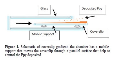 The coverslips were modified in the surface with polypyrrole (Aldrich 98%) by plasma glow discharge with the following reactor conditions: pressure was on 9x10-2 Torr, measured with a vacuum sensor (Edwards Active Gauge Control), power of 30 watts, obtained from a source of radio frequency at 13.5 MHz (Dressler Cesar RF). Reaction time was 30 minutes [8]. The gradient of Ppy was generated with a power of 30W on a cylindrical reactor, and the substrate was moved into the cavity 0.7 cm every 35 min. as shown in figure 1.