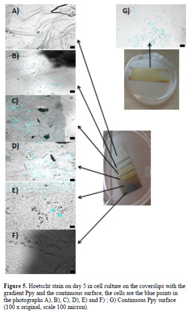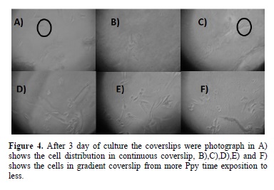 Figure 4 shows, the cell culture on continuous coverslip (A) with a uniform cell distribution, and the cell culture on the gradient coverslip from the bigger to the lower Ppy deposition (B to F); the proliferation increases in the central zones, the typical cell shape in the scaffold is marked in a black circle.