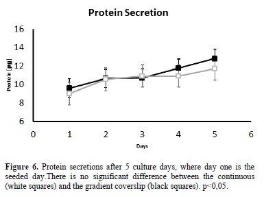 Figure 6 show the total protein rate in the supernatant of the cell culture medium. In the figure, the black squares line, represents the change of protein secretion in the medium after 5 days of culture on the gradient coverslip. The white squares line shows the total protein secretion in the continuous coverslip. As it can be seen, there is no significant difference in the two experiments.