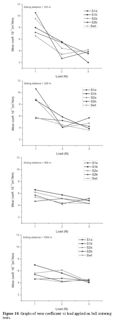 The reason for the three body type can be attributed to the fragmentation of abrasive particle after a long time of the test. After several revolutions in which the particle is rolling, this ends up breaking, reducing its size and changing its shape from angular to rounded, causing less severe wear (three body type). This phenomenon was seen in investigations of C. Cozza and M. Flores [18,32]. Another possible cause of the presence of three body wear in the craters at long distances (500 and 1000 meters), is related to the pressure during the test, which is determinative on the type of wear. In this case, the contact area of the sphere increased, then, the pressure during the test was reduced considerably, which promoted the rolling of the abrasive particles to produce the three body type of wear predicted in other studies [18,32]. Figure 10 shows the wear coefficient of treated samples with LSP and the untreated material with respect to the load applied during the test, the points on the graph are the average of three tests. The samples S1a, S1b and S2a showed lower wear coefficient than the untreated sample indicating that for low loads and short sliding distances the LSP treatment was effective in reducing the wear coefficient. The graphs indicate that when load increased, a decrement in the wear coefficient is observed. This can be explained by the equation (5); as the severity of contact decreases when the crater becomes larger (because the contact area increases). It is worth to mention that not all the lines have an evenly descending trend this is due to variation in the measurements obtained and, for the biphasic characteristic of the material. Another reason is that the abrasive behavior during testing i.e. as being independent particles, these suffer different type of deterioration [16,33].