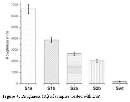 Surface roughness measurements showed that due to LSP treatment, roughness increased significantly with respect to the untreated sample. The average roughness (Ra) of the samples increased from ~200 nm before treatment to >6500 nm after LSP. Figure 4 shows the variation of roughness between samples.