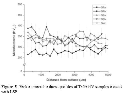 Looking at the treated samples, it can be observed that treatment with a wavelength of 532 nm generated higher surface roughness in comparison to those treated with a wavelength of 1064 nm. Also, a greater pulse density generated higher roughness. Such behavior of surface roughness variations is attributed to the power density selected for this investigation. It can be noted that the samples S1b, S2a and S2b final roughness is in the acceptable range considered in biomedical implants [9 ,10], since bone area which is in contact with the surface of the implant is dependent on the roughness of the implant. It is well known that this difference of roughness affects the surface contact energy. In the investigation of A. Wennerberg [19] it was concluded that a surface with a roughness of ~1.4 µm promotes better adhesion with the bone than a roughness of 1.2 µm. The LSP treatment with the parameters used in this study can produce in a controlled way roughness in the range for using in biomedical applications. Figure 5 shows the microhardness profiles, due to the dispersion of the data these do not reveal any conclusive change in the value of the microhardness of the treated samples with respect to the untreated ones. The observed dispersion is attributed to the biphasic nature of the Ti6Al4V alloy due to the intrinsic properties of both phases α and β. Dispersion of this type has also been reported in previous investigations where a titanium alloy similar to that used in this work was studied [20]. The profiles on the graph do not show a trend involving an increment, therefore, it is not possible to attribute increased microhardness. This may be due to that a single impact does not generate hardening, unlike other investigations showed where an increment on the microhardness values was verified after LSP treatment [21,22].