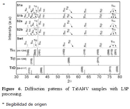 Figure 6 shows the X-ray diffraction patterns with the phases present in the alloy as well as the structural changes caused by LSP treatment. It was observed a clear shift for all β phase peaks approximately one degree with respect to the crystallographic reference card PDF 44-1288. This shift corresponds to a deformation of approximately 3% of the lattice of this phase (Tiβ), which is probably caused by the machining of the bar or the grinding process during preparation of the samples, as found in [23].