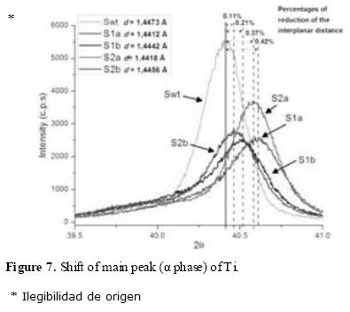 Diffractograms of the treated samples with LSP clearly show the appearance of two peaks at 37.62° and 43.63°, 2θ, which do not correspond to the untreated material. These peaks were identified as TiO (111) and (200) from the PDF 08-0117 crystallographic database. The formation of titanium oxide is due to the interaction between the material surface and the water layer when the laser beam impacts the material. This oxide is formed only on the surface of the material and has been reported in other studies [3,4,24,25]. It was observed that if the deformation layer is removed by a gentle polishing, the TiO peaks disappeared. Figure 7 shows a closer look at the main diffraction peak of the phase whose analysis was made between 39.5° and 41° of 2θ. The figure shows the shift in the main diffraction peak of the treated samples respect to untreated material in the (101) plane.