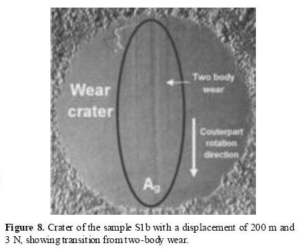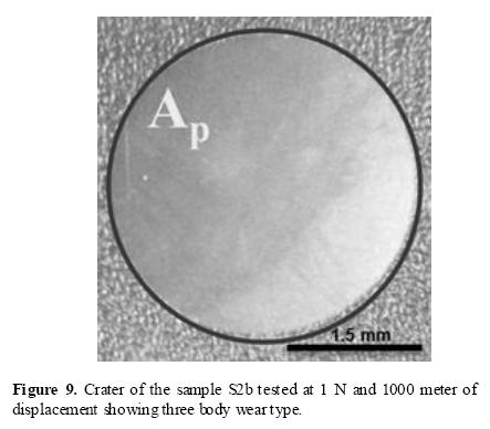 Figure 9 shows the representative micro-abrasion craters obtained from long displacement distances such as 1000 meters. Image clearly shows that the type of predominant wear correspond to three body wear since neither the scratching pattern nor the grooves characteristic of the two body wear were seen.