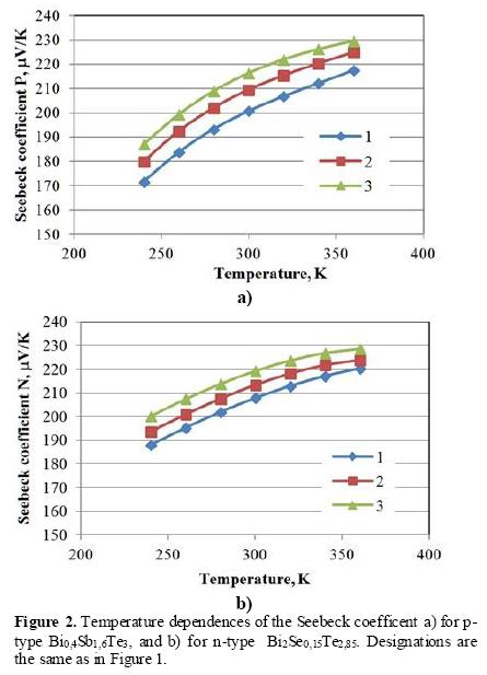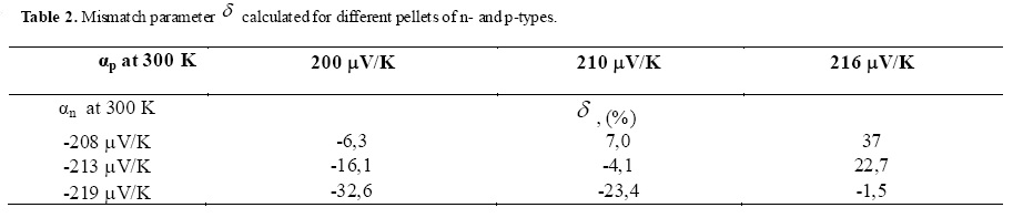 The table 2 shows that a perfectly matched thermocouple are materials with αn=219µV/K and αp= 216 µV/K, for which the highest value ΔTmax is obtained, according to Table 1. The pellets for the diagonal elements of the table are best matched. The absolute value of the n-type Seebeck coefficient is by several units higher than that of p-type. The data of Table 1 are consistent with these results. Thus, the criterion of proximity of the absolute values of the Seebeck coefficients for a thermocouple of pellets is well justified and convenient in practical use.