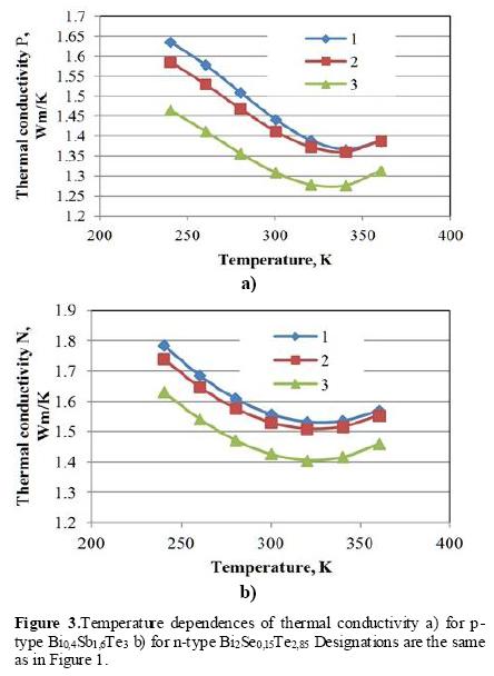 Temperature dependences of thermoelectric properties of extruded thermoelectric materials produced in the company RMT were defined on the facilities DX8080 produced by RMT. The six-wire measurement by Harman's method [4,5] was used. The sample size was (length x width x height) 2x2x1.6 mm3. The Ni antidiffusion layers were plated on the ends of the sample. The plating technology was the same as in mass production of thermoelectric modules. The results are shown in Figures 1-3 (2). The temperature dependences of figure-of-merit are shown in Figure 4. For the samples studied the figure-of-merit Z at 300 K equals (3,05-3,13)·10-3 K-1 for p-type and (2,832,87) 10-3 K-1 for n-type. These values are some what lower for p-type than those published in literature [6,7], which may be associated with a small elongation ratio (≈10) used in the extrusion tool. The figure shows that at 300 K the n-type figure-of-merit increases with the increase of the Seebeck coefficient, whereas in the p-type material it at first grows and then decreases. The average Z values of a thermocouple are within (2,95-2,98)∙10-3 K-1.
