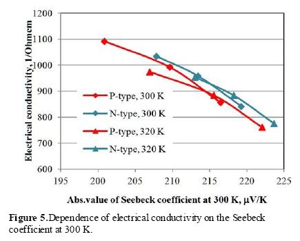 For the comparison of the dependences of electrical conductivities of the n-and p-type materials, Figure 5 shows the dependence of the electrical conductivity at 300 and 320 K on the absolute value of the Seebeck coefficient at 300 K.