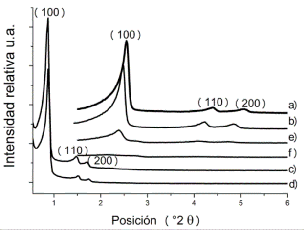 Por otro lado, en la síntesis de los materiales SBA-15 [16] se emplearon los siguientes reactivos: TEOS, ácido clorhídrico (HCl) 2M, agua desionizada e NaOH 5M con relaciones molares: 0.023:0.19:0.83:0.07 (TEOS:HCl:H2O:NaOH). Además, se emplearon 2g de Pluronic-P123 (poli(etilenglicol)-bloque-poli(propilen glicol)-bloque-poli(etilenglicol) (EO)20(PO)70(EO)20), como agente estructurante. En esta síntesis la agitación se mantuvo constante durante 24 h a 40 °C; posteriormente, el pH se ajustó a 2.6 empleando una solución de NaOH 5M y se dejó madurar sin agitación a 95 °C durante una semana.