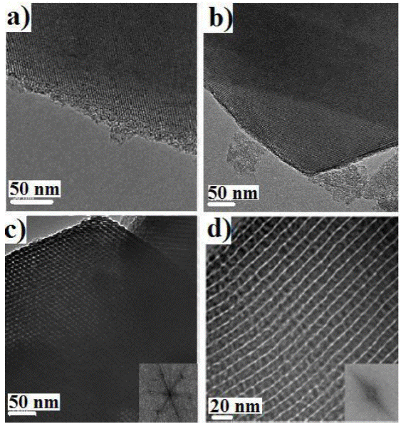 Figura 2 Resultados de HRTEM de la sílice mesoporosa. a) MCM-41 y c) SBA-15 el haz en paralelo hacía el eje de los canales, b) MCM-41 y c) SBA-15 el haz en dirección perpendicular al eje de los canales.