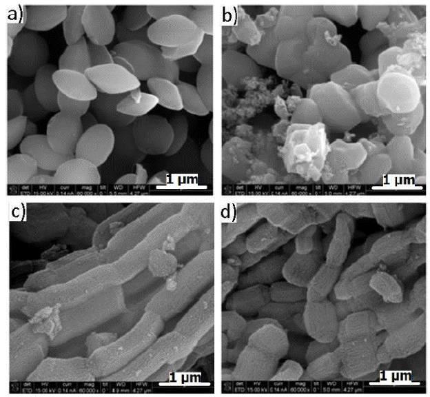 Los resultados de SEM nos permitieron dilucidar la morfología y la dimensión de las partículas. La muestra de MCM-41 (Figura 4a) exhibe morfología tipo almendra con una distribución de partícula de ~ 1 μm. En la muestra de FeMCM-41 (Figura 4b) las partículas adquieren otra morfología con variación en sus diámetros (desde 1 μπι hasta 130 nm). Mientras, que la morfología en las muestras SBA-15 y FeSBA-15 (Figura 4c y d), se tienen agregados de partículas tipo lazo, además el diámetro de partícula en SBA-15 es ligeramente menor que la del mesoporoso modificado FeSBA-15 y relativamente uniformes en ambos materiales (~ 4.3 μm).