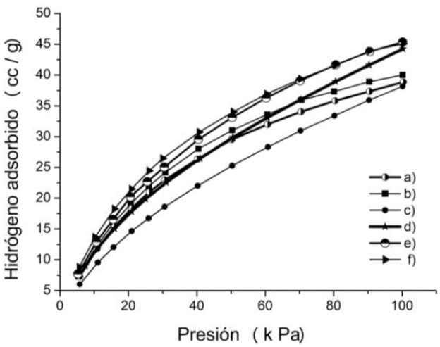 Finalmente, se evaluó la capacidad de sorción de H2 de los materiales obtenidos en un equipo BELSORP-MAX. Las pruebas se realizaron a -196 °C (nitrógeno líquido) y a temperatura ambiente (25 °C) y a baja presión (100 kPa). Previamente, los materiales fueron tratados a 150 °C bajo flujo de nitrógeno durante 20 h.