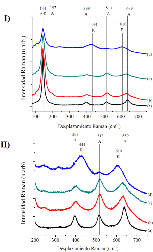 Figura 1 I) Espectros Raman de los catalizadores TiO2-Sn(x) con diferentes relaciones molares de Sn, x = (a) 0.0, (b) 0.3, (c) 0.4, y (d) 0.5; II) Amplificación de la región de 200 a 750 cm-1.
