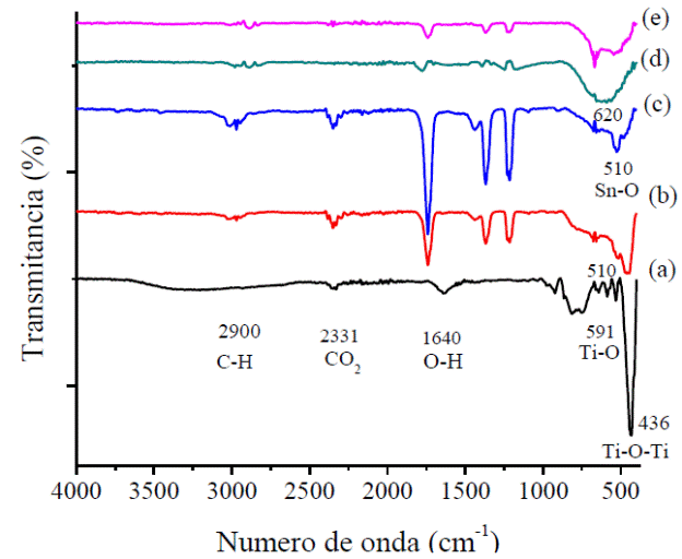 En los espectros de infrarrojo (Figura 2) se observa la banda atribuida a la elongación simétrica de Ti-O-Ti en 436 cm-1, la banda a 591 cm-1 se asocia al modo vibracional del grupo Ti-O. Por otro lado, la banda centrada en 1640 cm-1 corresponde a vibraciones de deformación de tipo tijera de los protones del agua adsorbida en la superficie [23-24]. Los picos a 2927 y 2854 cm-1, pueden ser asignados a tensiones C-H e indicar la presencia de materia orgánica remanente en los sólidos. Es evidente que en los espectros de los fotocatalizadores que contienen estaño las señales entre 500 y 1000 cm-1 se vuelven más anchas y menos intensas con el incremento en el contenido de estaño, lo cual se atribuye al traslape de las señales localizadas en 510 y 620 cm-1 características de las vibraciones de enlaces Sn-O con las vibraciones de enlace de Ti-O-Ti localizada en 436 cm-1 y la de Ti-O localizada en 591 cm-1[23].