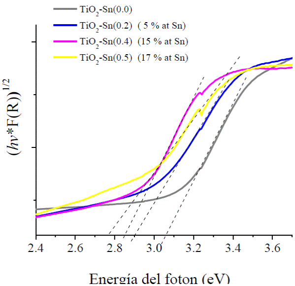 De los espectros UV-Vis adquiridos en el modo de reflectancia difusa, se determinó la función de Kubelka-Munk (F(R)) para posteriormente graficar [F(R) hv]1/2 vs. hv (Figura 4), para calcular el ancho de banda prohibida, considerando que los fotocatalizadores tendrían una energía de banda prohibida indirecta [26-27]. La energía de banda prohibida calculada para el TiO2 fue de 3.1 eV, la incorporación y posterior incremento de Sn en la formulación catalítica disminuye ésta energía a 3.0 eV para el catalizador que contiene un 5 %at. de Sn; un mayor incremento de Sn (15 y 17 %at.) lleva a energías de 2.9 y 2.8 eV, esta ligera disminución en la energía de banda prohibida, podría atribuirse a un efecto sinérgico debido al acoplamiento de las fases cristalinas anatasa y rutilo presentes en las muestras y ha sido reportado anteriormente tanto teórica como experimentalmente [10].