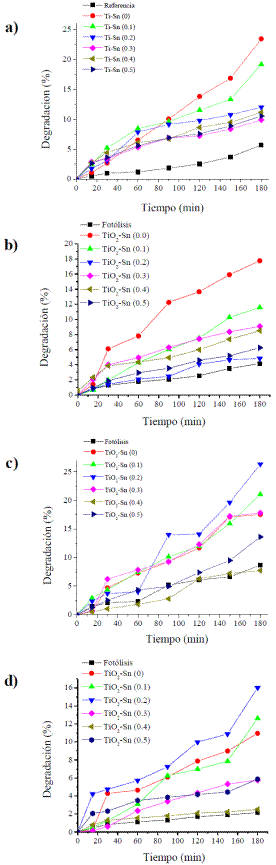 El grado de degradación en cada sistema de reacción se determinó indirectamente siguiendo la disminución de la concentración de cada fármaco en la solución, a partir de la intensidad de su banda de absorción característica, en función del tiempo de reacción. Para este propósito se establecieron las curvas de calibración que relacionan la C0 de cada fármaco en la solución con la intensidad de las bandas de absorción UV-Vis correspondientes a cada fármaco, las cuales están localizadas en 275 nm para diclofenaco, 243 nm para el paracetamol, 222 nm para el ibuprofeno y 262 nm para el naproxeno. La reacción se llevó a cabo a un pH aproximado entre 5.7 y 6.5 y se monitoreó durante 180 min, analizando alícuotas tomadas del sistema reaccionante cada 15 minutos. En la Figura 5a se presentan los resultados obtenidos en la degradación de diclofenaco, donde se observa un máximo de degradación después de 180 min, de aproximadamente 23 %, utilizando el catalizador de TiO2 sin modificar. Al incorporar Sn, el grado de degradación se reduce a valores de alrededor de 19, 12, 10, 11 y 10 % para las formulaciones catalíticas con relaciones molares x = 0.1, 0.2, 0.3, 0.4 y 0.5, respectivamente, siendo claro que el incremento en el contenido de estaño tiene un efecto de detrimento sobre el desempeño fotocatalítico. Se incluye el dato de la reacción no catalizada (fotólisis) como referencia, en este caso se observa un grado de degradación menor, de aproximadamente 2 a 7 %, que para el caso del naproxeno es hasta 8 veces menor que la reacción catalizada. En la degradación de paracetamol, Figura 5b, se observa que la formulación catalítica sin estaño TiO2-Sn(0.0) alcanzo nuevamente la mayor actividad catalítica (17.8 %) respecto a la de los catalizadores modificados, que muestran porcentajes de degradación de 11, 5, 9, 8 y 6 % respectivamente, no siguiendo una tendencia clara en términos del contenido de estaño. Para el caso del ibuprofeno, se observó un comportamiento diferente al de los otros fármacos, después de 180 min de reacción la formulación catalítica TiO2-Sn (0.2) alcanzó el grado de conversión más alto, 26 %, mientras que el catalizador sin Sn solo degrado el 18 %, similar a los catalizadores con relaciones molares 0.1 y 0.3; a mayores concentraciones de Sn disminuye la respuesta fotocatalítica como se muestra en la Figura 5c. La degradación de naproxeno fue menor y más lenta respecto a las otras moléculas de AINEs (Figura 5d), que junto con el hecho de ser la que está presente en menor concentración y con menor turbidez, hace suponer una mayor resistencia de esta molécula a ser degradada; en este caso el fotocatalizador TiO2-Sn (0.2) alcanzo la mayor degradación (16 %), similar a lo observado para el ibuprofeno.