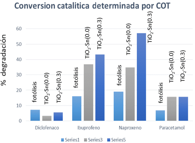 Con el propósito de verificar si la ruta de degradación de los AINES tratados con los fotocatalizadores preparados es vía la mineralización, en la Figura 6 se muestran los datos de conversión obtenidos a partir de las mediciones de COT; es importante señalar que estos resultados muestran también que el fotocatalizador que contiene estaño da como resultado grados de conversión mayores y sugieren que efectivamente la degradación es a través de la mineralización de la molécula orgánica. También se debe mencionar que en este caso los grados de conversión son mayores que los determinados a través de las mediciones obtenidas a partir de las curvas de absorción óptica, lo cual podría atribuirse a las dificultades de medición con esta técnica debido a la alta concentración de los fármacos así como a la presencia de solidos suspendidos y materia orgánica disuelta en las aguas residuales, que es posible influyan de manera importante en las determinaciones por COT.