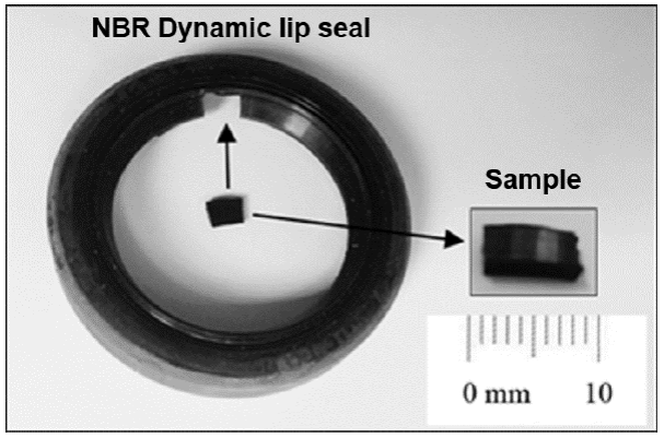 The specimens were extracted from an actual commercial dynamic seal. It consisted of a nitrile butadiene rubber (NBR) lip without steel frame. The lip was completely flat. Hence, the samples were cut from the lip towards achieve small flat pieces, as it is shown in Figure 2.