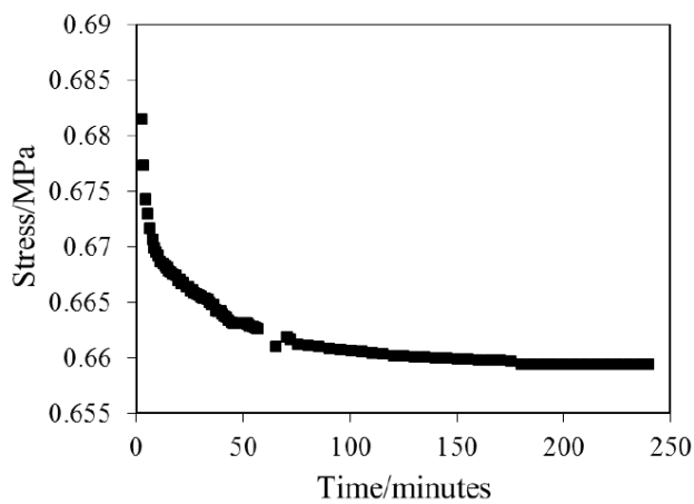 The ball roughness was measured by using a contact profilometer (Dektak 150 stylus) while the roughness of the NBR samples was evaluated by an optical profilometer (Contour GT-K, Bruker). An approaching of the elastic properties (Young's modulus) of NBR specimens was obtained by instrumented Berkovitch nano-indentation tests (CSM Instruments, TTX-NHT). They were conducted at room temperature (22 ± 2 °C). The indenter was held at a maximum load of 5 mN and the loading rate was selected as 30 mN/min. A load holding period of 10 s was given. A total of 5 indentations were performed for each sample. The poissons ratio (v) was obtained from values reported for common elastomers [15]. Additionally, in order to determine a representation of the viscoelastic behaviour of the NBR specimens, a compression stress relaxation test was performed. It consisted on setting a sample between two plates and then compressing it to a predefined constant strain (30 ± 5 %). A load cell was connected to the upper plate, which records the force value to a computer. The force was monitored during 240 minutes. Hence, the representation of the stress relaxation behavior of the samples with time at a specified constant deformation is seen in Figure 3.