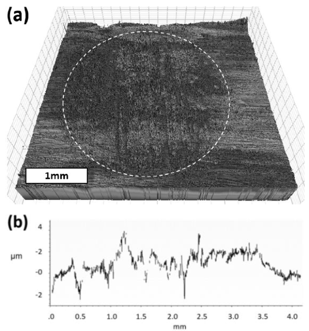 Figure 7 (a) 3D-Image from a wear scar produced under the action of three-body abrasion; (b) horizontal profile from the scar.