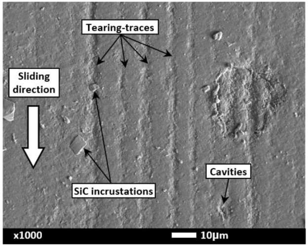 The pattern of two body abrasion on NBR found consisted on several tears without defined arrangement (tearing) along the sliding direction while the pattern of three-body abrasion was identified as a micro-stripped texture with regular arrangement parallel to the ball sliding direction. The texture was mainly composed of several micro-traces produced by the action of the SiC particles movement into the interface.