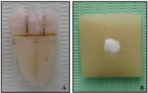 The selected molars were divided into four groups of 60 samples each: the Healthy group (H), the Mild group (MI), the Moderate group (MO), and the Severe group (S). All molars were stored in distilled water (Milli-Q, Millipore Co., Billerica, MA, USA) at 4 °C until experimental procedures were performed. Each buccal surface of molars healthy and pathologic fluorosis was sectioned perpendicular to the long axis of the tooth by means of a water-cooled low-speed diamond saw (#7910, medium size grain; Brasseler, Savannah, GA, USA) to obtain samples 3 mm in width (Figure 1A). The samples were then mounted in acrylic blocks (Figure 1B), followed by ultrasonic cleansing in distilled water.