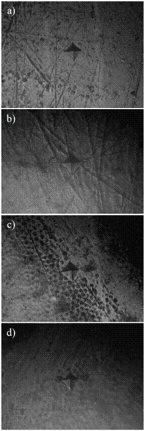 All samples were subjected to hardness indentations made with the Vickers hardness machine HV-1000 (DongGuan Sinowon Precision Instrument Co., Ltd. South District DongGuan, China) using a 50 gf load and a dwell time of 30 seconds. Three indentations separated by 0.4 mm, were made for each sample and the average value was recorded as the surface microhardness.