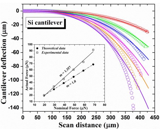 Figure 4 Si Cantilever deflection vs scan distance at different forces (open symbols). The solid lines represent the lines fitted using the Euler-Bernoulli equation. The inset depicts a comparison between theoretical (filled circles) and experimental data (open squares).