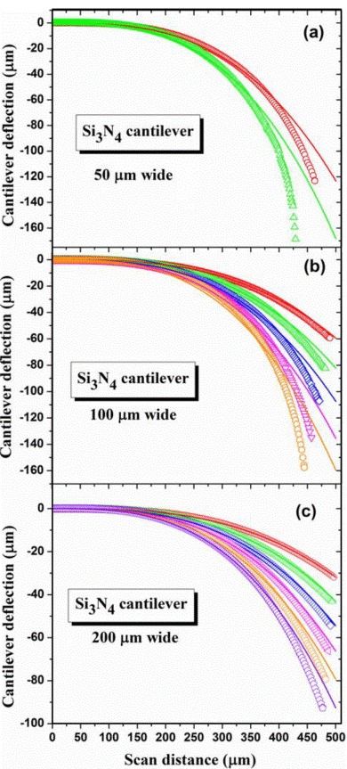 Figure 5 Silicon Nitride (Si3N4) cantilevers deflection vs scan distance at different forces for a) 50 μm, b) 100 μm and c) 200 μm wide. The solid lines represent the fit using the Equation (1).