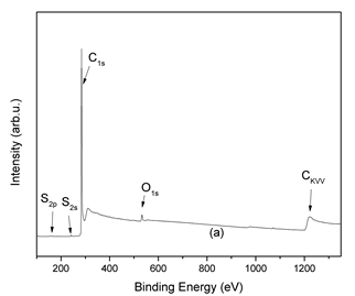 In Figure 1, we can see the XPS survey spectrum; the peaks are related with the C1s, O1s, S2p, S2s photoelectron emission and a CKVV Auger peak. The identification of the above-mentioned elements is in agreement with the EDS results.