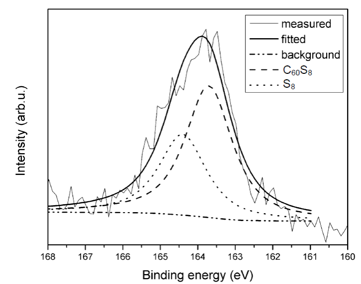 The high-resolution spectrum of the 2p sulfur peak is determined by its chemical environment and could elucidate the role that sulfur has on the optical properties of Mexican amber. Figure 3 shows the adjustment to the high resolution spectrum of 2p sulfur employing two peaks corresponding to: sulfur atoms bonded to carbon atoms (C60(S8)2) at 163.7 eV and sulfur molecules (S8) at 164.4 eV [16]. The reports of characterization of amber using the XPS technique are scarce, we only found one pair [6,17] corresponding to amber obtained from European countries in which the peak related to sulfur is assigned to sulfate species with a binding energy of 168.4 eV. Our results for Mexican amber are different and correspond to sulfur molecules and to sulfur incorporated within a carbon matrix. Our results are in agreement with the report by Riquelme et al. [11], where they found a K edge of sulfur in the characterization of amber from Chiapas by XANES spectroscopy. The fact that we do not find sulfur in reduced or intermediate states could be due to the low abundance of these species in the studied sample.