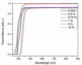 The optical transmission of the sample was measured using a Perkin Elmer spectrophotometer, model Lambda 40.