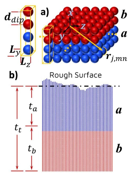 Figure 1 a) Left: Schematic representation of a TUC composed by two different materials. Blue spheres represent the point dipoles mimicking a generic material a; red spheres, of a generic material b. Right: Multiple replicas of the TUC representing an infinite thin film with a bilayer a/b structure and having a smooth flat surface. Incident light strikes first on layer a. b) Cross section of a TUC to mimic an a/b bilayer with rough surface. The red dots represent the smooth layer with thickness t b . The blue dots represent the layer with roughness and thickness t a .