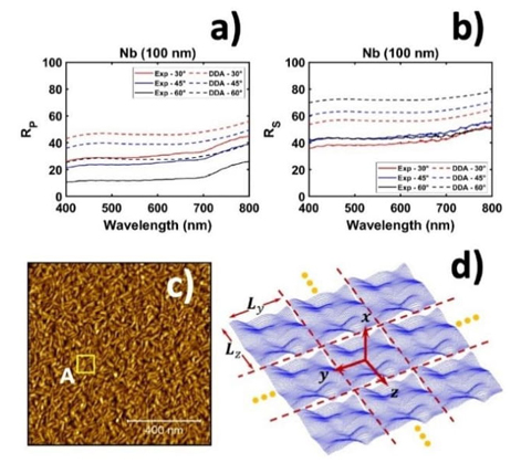 A thin film of Nb was deposited by magnetron DC sputtering using a Si <100> substrate. Table 1 shows the experimental parameters used during deposition. Figures 2a and 2b show the experimental spectra (solid lines) obtained for this sample for p-(parallel) and s-(perpendicular) reflectance respectively, obtained at different angles of the incident light. These experimental results were compared to those obtained with DDA (dashed lines) considering the same thickness of the actual sample but with a smooth surface. The calculated and measured spectra show the same shape-line but slightly different intensities. The numerical calculations were performed considering a smooth surface and using a dielectric function of a bulk sample (without border grains). The latter explains the prediction of a higher reflectivity than that measured for the Nb thin film. The topography of the obtained film was measured with a Bruker Dimension Edge atomic force microscope (AFM) in ScanAsyst measurement mode. A ScanAsyst Contact Air probe with a tip radius of curvature <20 nm was used. The film is 100 nm thick, and has a roughness of ±1 nm. Figure 2c shows a representative AFM image of the sample. A uniform distribution of particles and thickness of the thin film was observed along the sample.