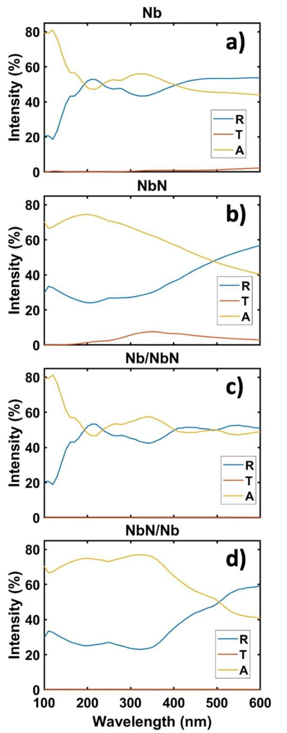 Figures 3a and 3b show the calculated reflected, transmitted, and absorbed light obtained for ideal smooth layers of Nb and NbN, respectively. The thickness of each layer is 50 nm. At normal incidence and above 200 nm, the light on the Nb metallic layer is mostly reflected and absorbed, whereas a relatively insignificant amount is transmitted. The transmitted light by the NbN layer is also insignificant compared to the reflected and absorbed light. Figures 3c and 3d show R, T and A of a bilayer of Nb and NbN with a configuration a/b, indicating that the light travels from layer a through layer b. The thickness of each layer is of 50 nm, and the total bilayer thickness is, therefore, 100 nm. We observe that, from Figure 3c, that in an interval of wavelengths from ultraviolet to visible, the optical response of the Nb/NbN bilayer is similar to that of a single Nb layer, except at wavelengths of 400 nm and larger. This indicates that at those wavelengths, the small portion of light that gets transmitted by the Nb layer is enough to excite the adjacent NbN layer.