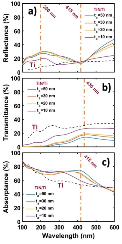Finally, for the TiN/Ti nanostructured material, its optical response spectra are shown in Figure 5. In the reflectance spectrum, a relative maximum at 220 nm and minimum at 415 nm are visualized. The same behavior is observed in the TiN/Ti [t a =50 nm] and TiN/Ti [t a =20 nm] nanostructures. In the case of TiN/Ti [t a =10 nm], the maximum is observed at 220 nm, whereas above 300 nm the qualitative behavior resembles that of a Ti monolayer. In its transmittance spectrum, a decrease in the intensity is observed as the thickness of the TiN layer begins to increase. In addition, a band at 435 nm begins to slightly define. On the other hand, in the absorptance spectrum, a relative maximum at 415 nm is observed. It should be noted that this maximum begins to shift towards longer wavelengths, i.e., at lower energies, as the thickness of the TiN layer with a rough surface increase.