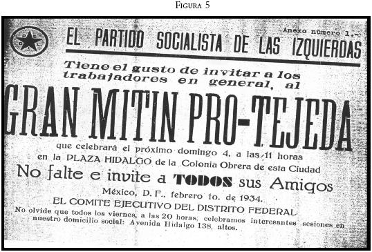 Pero no todo era información positiva, pues no fueron escasos los momentos de persecución a los militantes del partido o de disolución violenta de sus actos de proselitismo. Por ejemplo, el 5 de febrero de 1934, el presidente y el secretario del PSI se dirigieron al jefe del Departamento Central del Distrito Federal para pedirle garantías para realizar sus eventos políticos. El día anterior, un mitin en el mercado Hidalgo de la colonia Obrera (figura 5) había sido suspendido debido a que se presentó un grupo de policías al mando de un oficial, interrumpiendo éste al orador, exigiéndole el permiso para tal acto: