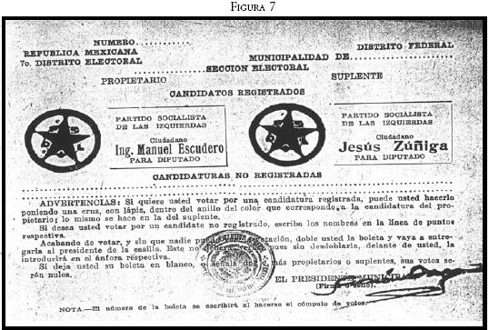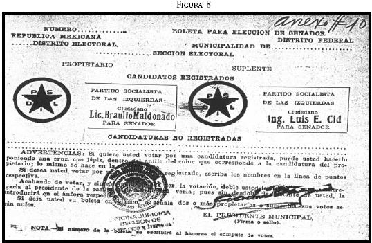 A la par de la candidatura presidencial, el PSI postuló también a un conjunto de candidatos a diputados por diversos distritos electorales del país. Por el primer distrito de Guanajuato postuló a Policarpo Torres y Eligio Leyva; por el décimo distrito de Jalisco, a Carlos Aviña y Guadalupe Nava; por el onceavo distrito de Puebla, la fórmula Ramírez y Santos; y por el octavo distrito de Veracruz, a Sotero Aizaba y José Giles,40 entre otros. Pese a la noticia de que había presentado candidatos en los doce distritos electorales del Distrito Federal, en los resultados sólo aparecen datos para el primero (José Godínez y Máximo Axotla), el segundo (Alejandrino Hernández y Medardo Velázquez), el séptimo (Manuel Escudero y Jesús Zuñiga, figura 7), el octavo (Anastasio Hernández y Daniel Sora) y el noveno (Crisóforo Rodríguez y Félix Ponce), además de las candidaturas al senado de Braulio Maldonado y Luis E. Cid (figura 8).41 Ninguno de ellos llegó al Congreso de la Unión.