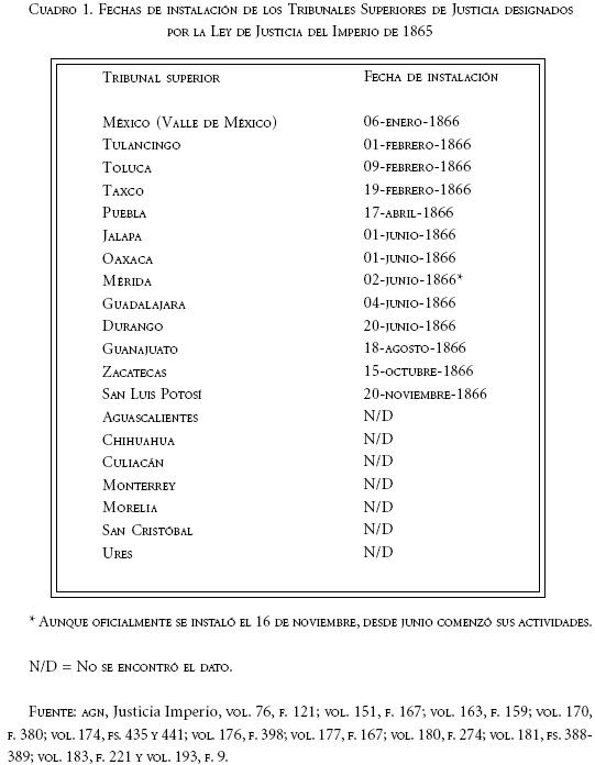 Como se mostrará en las siguientes páginas, estos tribunales superiores tuvieron que enfrentar diversos obstáculos para su instalación y funcionamiento, e inclusive algunos no pudieron establecerse a pesar de que fueron nombrados todos sus integrantes y que cobraron sus salarios durante algunos meses. Uno de los principales problemas derivados de esta situación fue que, mientras no se erigieran los nuevos tribunales, no entraría en vigor la Ley de Justicia del Imperio. En tanto, continuarían funcionando los mismos tribunales y juzgados de todas las instancias, con apego a las leyes anteriores a la de 1865.55 En el cuadro 1 se presentan los mencionados tribunales y las fechas en que fueron puestos en marcha.