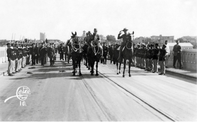 La procesión, lenta, penetró por la avenida Convent y convergió en el puente internacional. El cortejo se detuvo. Varios aviones que sobrevolaban arrojaron flores. Ésta fue la última cortesía que Estados Unidos le tributó a los restos de Carranza: “Un cuerpo de infantería hizo tres salvas de fusilería y una banda mexicana tocó el himno nacional de México. El mayor Williams colocó una corona de flores sobre la caja, mientras que un clarín daba los toques luctuosos de reglamento. Las tropas americanas y mexicanas presentaron armas”.151 En Laredo, Texas, el general José Luis Amezcua representó al Departamento de Aviación de la Secretaría de Guerra y Marina; al presidente Calles, el coronel Castrejón.