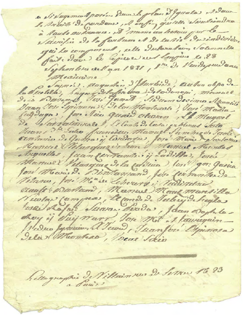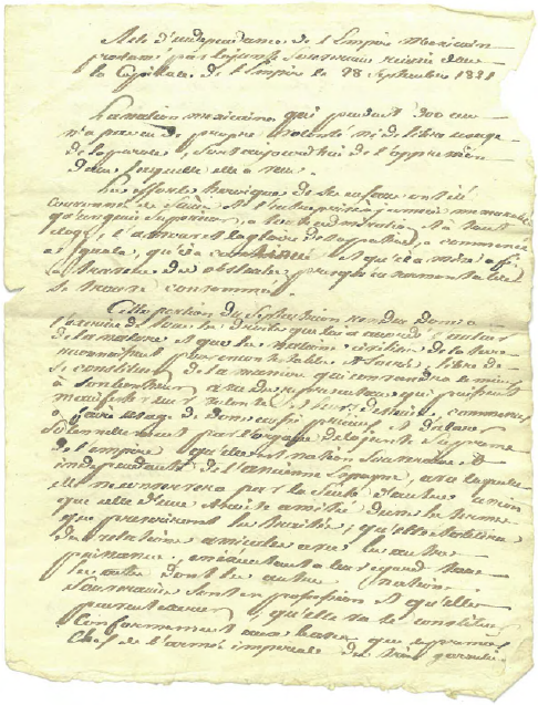 Empero, existe una copia del Acta de Independencia, que seguramente Theubet tradujo al francés (Anexo 1) y que guardó celosamente hasta su muerte, dicho documento consta de una foja, escrita en ambos lados y se encuentra en el Archivo del Antiguo Obispado de Basilea. La reproducción tiene en su parte final la leyenda de donde fue elaborada “hellographie de Villain rue de Serres 16 23 a París”.86 No conocemos las intenciones de Theubet sobre esta copia, tal vez la guardó como recuerdo, o para la creación de futuros negocios, pero evidentemente la consideró un documento valioso. En cuanto al Acta original que había sustraído el coronel suizo, esta estuvo en posesión del rey Fernando VII seguramente hasta su muerte, y se conservó el documento gracias a la sustracción realizada por Theubet.