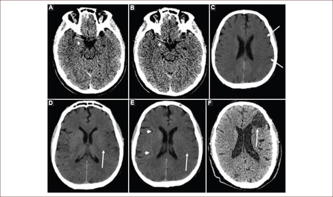Figure 1 Classic early ischemic signs in a non-contrast computed tomography: A and B: show a hyperdense right middle cerebral artery sign (white arrow head). C: shows the loss of gray-white matter differentiation at the surface cortex (white arrows). D: hypoattenuation of the lentiform nucleus (white arrow). E: loss of gray-white matter differentiation at the left insula (insular ribbon sign, white arrow) compared to a normal right insular ribbon (white arrowheads). F: shows a chronic cortical infarct (white arrow) with ventricular deforming due to gliosis.