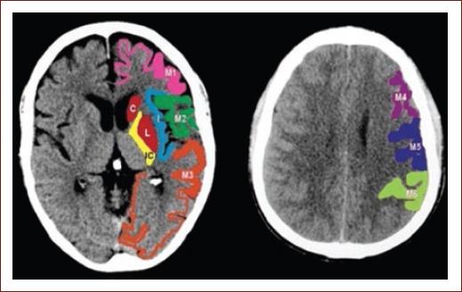 NCCT alone is used in the initial assessment of patients with the clinical diagnosis of AIS. NCCT has three uses in the acute period: ruling out hemorrhage, detection of non-acute lesions, and detecting hyperacute changes that may suggest acute ischemia. In most stroke centers, the first study in the evaluation of suspected AIS is a NCCT, as it answers the first question one should ask themselves when dealing with an acute, sudden neurological deficit: "does this patient have an intracranial hemorrhage?"9 If no bleeding is detected, and, depending on clinical variables, rtPA could be initiated if inclusion criteria were met. The classic early ischemic signs seen in NCCT (Fig. 1) are obscuration of the lentiform nucleus, loss of gray-white matter differentiation at the insula (insular ribbon sign), loss of gray-white matter differentiation at the surface cortex, and hyperdense artery sing (may be indicative of a thrombus within the MCA)22. The Alberta Stroke Program Early CT Score (ASPECTS, Fig. 2)26 is the most widely used method to assess the extent of early ischemic changes27. ASPECTS is a validated, prospective score, that allows us to have an idea of the infarct's extension. This method divides the MCA's territory into ten regions, and for each hypodensity, in each of these regions we will subtract a point (the abnormality must appear on at least two consecutive 5 mm cuts); a score of < 6 is considered to suggest extensive, established injury, and a lower probability of a good outcome27. In general, an ASPECTS of 6-10 was used as an inclusion criterion in endovascular trials, such as ESCAPE28, SWIFT PRIME29, and REVASCAT30, to select patients with a relatively small core infarct. ASPECTS assessment is affected by CT quality. It is important for the grayscale of NCCT to be properly adjusted for brain parenchyma so that the gray-white matter differentiation is readily distinguished9.